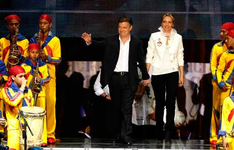 Juan Manuel Santos, candidato del Partido Social de Unidad Nacional, acompañado de su esposa, María Clemencia, celebra su aplastante victoria en la segunda vuelta, en la que obtuvo 69.05 por ciento de los votos frente a 27.52 por ciento de su contrincante del Partido Verde, Antanas Mockus. El electorado escogió seguir cuatro años más bajo el esquema político diseñado por el presidente Álvaro Uribe. La jornada comicial estuvo marcada por el abstencionismo, que en esta ocasión llegó a 55.59 por ciento. El ahora presidente electo, tras llamar a establecer una hoja de ruta para lograr una justicia eficaz, gritó: ¡vivan las fuerza armadas!. También dijo que a las FARC se les agotó el tiempo Foto Reuters