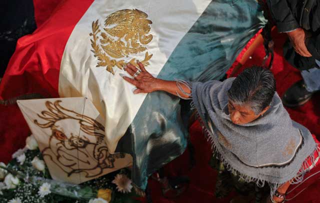 Una multitud logró entrar finalmente al recinto para despedir al cronista. ‘‘¡Viva Monsi eternamente! ¡Viva el hombre del pueblo! ¡Monsi no es vi ai pí!’’, exclamaban desde fuera, porque las guardias de honor continuaban y la fila de los comunes no avanzaba. Los que ingresaban depositaron ramitos de flores, se persignaban y acariciaban la bandera. En el féretro se colocó un papalote con la caricatura del escritor realizada por Rafael Barajas El Fisgón Foto Cristina Rodríguez