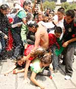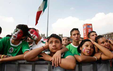 Los miles de aficionados que se congregaron en el Zócalo mostraron su frustración tras la derrota de la selección nacional contra Uruguay por 0-1. Al término del partido, decenas de ellos decidieron festejar en el Ángel de la Independencia el pase del cuadro tricolor a octavos de final. Sin embargo, la movilización culminó en desmanes, ya que grupos de jóvenes se dedicaron a acosar a mujeres (imagen de la derecha) y a enfrentar a la policía. Las autoridades capitalinas informaron que 73 personas fueron detenidas. En rueda de prensa en Rustenburgo, Sudáfrica, Javier Aguirre dijo: