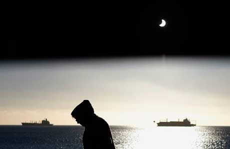 El fenómeno se observó ayer en territorio chileno. En la imagen, la Luna comienza a cubrir al Sol durante el eclipse, visto aquí en el puerto de Valparaíso. En la isla de Pascua, a 3 mil 700 kilómetros de la costa, con el cielo despejado, se observó a plenitud. A 14:10 horas locales todo quedó en penumbra durante cuatro minutos y 41 segundos, en los que sólo se podía ver la corona del astro rey Foto Reuters