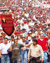Integrantes del SME marcharon y realizaron ayer un plantón ante la CFE para exigir, como patrón sustituto, la reinstalación de empleados sin liquidar Foto Marco Peláez