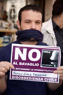 La organización Pueblo Púrpura realizó una manifestación frente al parlamento italiano en repudio a la llamada ley mordaza, que limita las intervenciones telefónicas en las investigaciones judiciales y castiga, incluso con cárcel, a los periodistas que publiquen sus contenidos Foto Stefano Montesi
