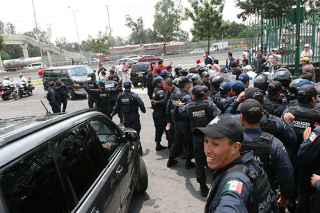 Debido a la presencia de integrantes del SME, que le gritaron consignas, decenas de agentes protegieron la salida del funcionario, quien encabezó la entrega del Premio Nacional de Trabajo en el Museo Tecnológico de la Comisión Federal de Electricidad. Según la STPS, el vehículo del secretario fue apedreado al salir del inmueble. Sin embargo, ni reporteros ni fotógrafos captaron la presunta agresión Foto La Jornada