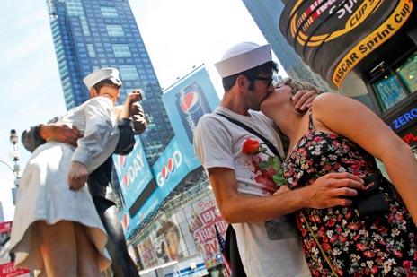Como el 14 de agosto de 1945, Times Square, en Nueva York, fue testigo del ósculo con que se celebró el fin de la Segunda Guerra Mundial. En esta ocasión, estadunidenses y turistas extranjeros reprodujeron la escena, plasmada en una célebre fotografía de Alfred Eisenstaedt Foto Ap