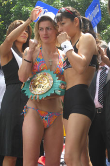 La Guerrera mexiquense mostró confianza en vencer –por nocaut o por decisión– a La Tigresa alemana (en la imagen, con biquini de colores) esta noche en la Plaza México Foto Carlos Hernández