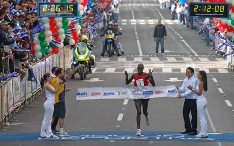 Funcionarios del gobierno capitalino y edecanes acompañaron al corredor africano en el momento de cruzar la meta en el Zócalo. Con un tiempo de 2:12.20 horas, el atleta logró su tercer triunfo en esa competencia y obtuvo 300 mil pesos por esta edición, y 100 mil más por romper su propia marca. Expresó su deseo de representar a México en los Juegos Olímpicos de Londres 2012. La tlaxcalteca Karina Pérez Delgado venció en la carrera de mujeres, al cronometrar 2:39.42 horas en cerrado duelo con la keniana Janet Rono Foto Cristina Rodríguez