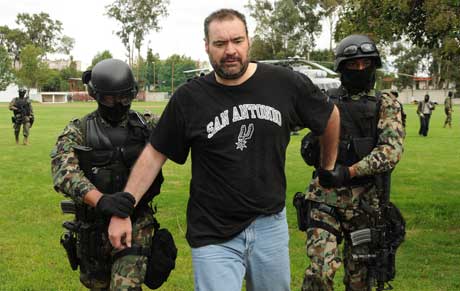 Sergio Villarreal Barragán, El Grande, es escoltado por marinos tras su aprehensión en una residencia del fraccionamiento Puerta de Hierro, en la capital poblana. Según reportes oficiales, fue una acción