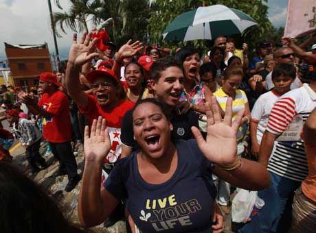 Simpatizantes del presidente Hugo Chávez lo saludan en Caracas cuando éste se disponía a votar ayer durante las elecciones legislativas Foto Ap