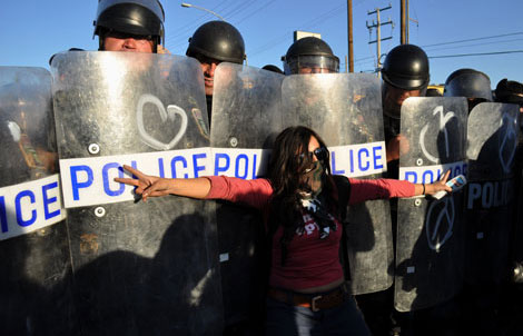 En el encuentro de evaluación del programa Todos Somos Juárez, la sociedad civil de esta urbe fronteriza reprochó al Presidente el escaso avance en los planes para la reconstrucción del municipio chihuahuense. Le exigieron que tome las medidas necesarias para detener los crímenes de alto impacto, que cumpla su promesa de enviar agentes del Ministerio Público y que establezca un régimen fiscal de excepción. Señalaron que sólo en 2010 se han cometido 2 mil 421 homicidios. Cerca del lugar de la cumbre sobre seguridad que sostuvo el jefe del Ejecutivo con gobernadores electos hubo protestas de activistas Foto Ap
