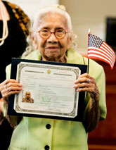 Eulalia García Maturey muestra su certificado de naturalización, el cual le fue entregado ayer en Brownsville, Texas. La anciana llegó con sus padres a Estados Unidos, procedente de México, hace 101 años Foto Ap