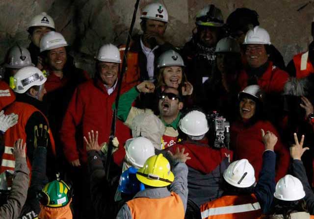 Mario Sepúlveda estalla de emoción tras ser rescatado de la mina de San José a la 1:09 horas del miércoles (dos horas menos en México). Fue el segundo en emerger –luego del capataz Florencio Ávalos– en una cápsula de 66 centímetros de diámetro a través de un ducto de más de 600 metros. A su lado, el presidente Sebastián Piñera Foto Reuters