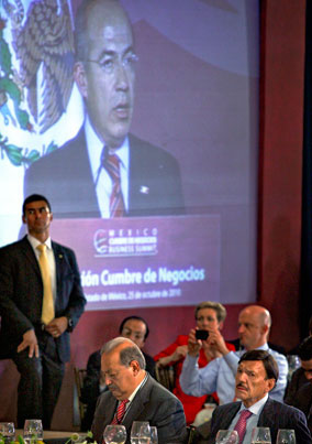 Empresarios como Carlos Slim y Roberto González Barrera participaron en el foro México, Cumbre de Negocios, organizado por Miguel Alemán Velasco, en Toluca. Ayer, el presidente Felipe Calderón insistió en que el país no sólo está en la ruta de crecimiento, sino que su economía es ahora más fuerte que hace muchos años Foto Cristina Rodríguez