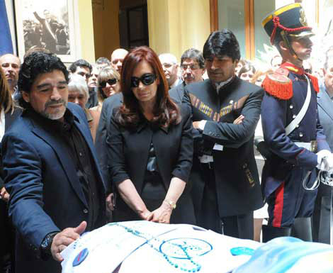 El futbolista Diego Armando Maradona y el mandatario de Bolivia, Evo Morales, ofrecieron sus condolencias a la presidenta argentina, Cristina Fernández, por el deceso de su esposo, Néstor Kirchner. En filas hasta de 25 cuadras, miles de personas pasaron junto al féretro, el cual fue colocado en el Salón de los Patriotas Latinoamericanos, en la Casa Rosada Foto Ap