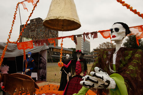 El olor a copal, las catrinas, las flores de cempasúchil, el papel picado y las calaveritas de azúcar invadieron la explanada de Ciudad Universitaria, dentro de la Megaofrenda con que la UNAM mantiene viva una de las tradiciones de la cultura nacional. En el Zócalo el gobierno capitalino montó la suya, dedicada este año a Carlos Monsiváis, Jorge Reyes y Guadalupe Posadas Foto Carlos Ramos Mamahua