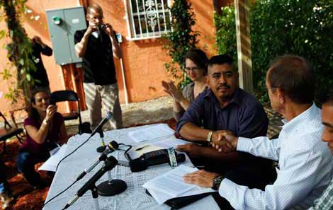 El guerrerense Lucas Benítez, uno de los fundadores de la Coalición de Trabajadores de Immokalee, y Reggie Brown, encargado de la agrupación Florida Tomato Growers Exchange, se dan la mano tras firmar el acuerdo que permite mejorar las condiciones laborales, de salud y salariales de los jornaleros inmigrantes, sobre todo mexicanos y guatemaltecos. Los granjeros entregarán un centavo más por libra de cosecha, luego del convenio con los principales compradores de jitomate, entre ellos las cadenas Taco Bell, McDonald’s, Subway, Burger King y otros Foto Ap