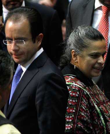 La dirigente priísta Beatriz Paredes dialoga en San Lázaro con integrantes de la bancada panista, con la cercanía de César Nava, presidente nacional del blanquiazul Foto Marco Peláez