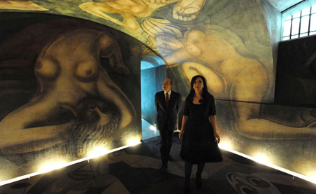 Felipe Calderón y la mandataria de Argentina, Cristina Fernández, inauguraron el mural restaurado Ejercicio plástico en un recinto ubicado junto a la Casa Rosada. La obra de David Alfaro Siqueiros había sido fragmentada y guardada en cuatro contenedores. Su recuperación estuvo a cargo de especialistas mexicanos y del país austral Foto Ap /Oficina de prensa de la presidencia de Argentina