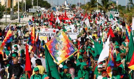 Miles de integrantes de Vía Campesina, de la Asamblea de Afectados Ambientales y de una veintena de organizaciones mexicanas marcharon por la calles de este centro turístico para exigir que se aborden ya negociaciones concretas que permitan reducir las emisiones de gases de efecto invernadero. Al abrir el segmento de alto nivel en la conferencia de Naciones Unidas, Estados Unidos reiteró que no participará en ningún acuerdo que sea jurídicamente vinculante. El presidente Felipe Calderón llamó a las naciones a dejar de lado intereses particulares y enfrentar unidos el gran desafío ecológico. Ban Ki-moon, secretario general de la ONU, expresó: