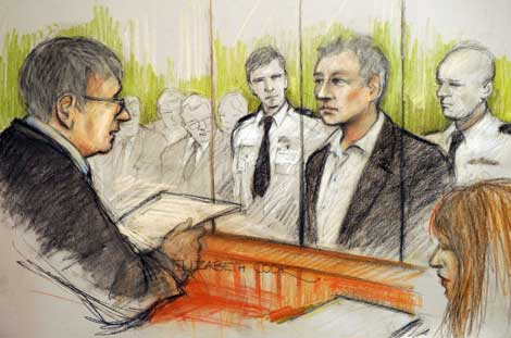 Dibujo de la presentación de Julian Assange, fundador de Wikileaks, quien ayer cumplió un citatorio de la corte de Westminster, en Londres, para responder a las acusaciones de dos mujeres suecas por violación y asalto sexual, las cuales rechaza. El juez de distrito le negó la libertad bajo fianza al considerar que existe el riesgo de que escape. Permanecerá en prisión al menos hasta el 14 de diciembre, cuando comparezca de nuevo Ilustración de Elizabeth Cook/Ap