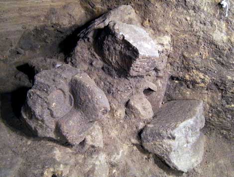 Piedras rituales que representan un ave, probablemente un águila, yacen en el pasaje subterráneo descubierto en la Ciudadela, frente al Templo de la Serpiente Emplumada, en Teotihuacán. El sitio fue cerrado hace más de mil 800 años Foto Sergio Gómez Chávez