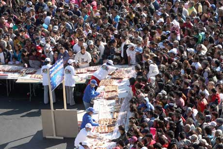 Miles de personas esperaron más de dos horas en la plancha del Zócalo capitalino para recibir un pedazo de Rosca de Reyes y un cuarto de leche. Sin embargo, en 30 minutos el megapán desapareció de las mesas. La rosca midió 720 metros, pesó 9 mil 375 kilos y fue elaborada por integrantes de la Cámara Nacional de la Industria Panificadora. Familias de la capital y zona conurbada se aglomeraron en busca del tradicional bocado, aunque con cierto temor de sacar