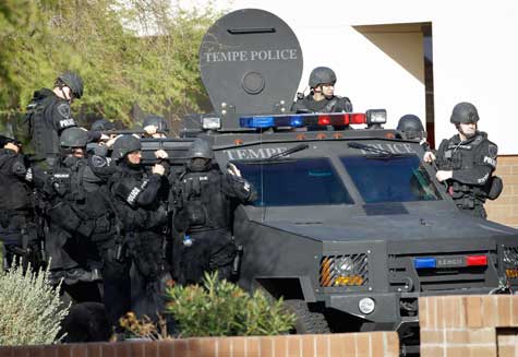 Fuerzas especiales de seguridad del estado de Arizona acudieron ayer a un centro comercial ubicado en la comunidad de Chandler, donde un hombre se introdujo al restaurante Baja Fresh con la intención de robar e hizo varios disparos, aunque no se reportaron lesionados. La policía intercambió fuego con el asaltante, quien finalmente se rindió Foto Ap