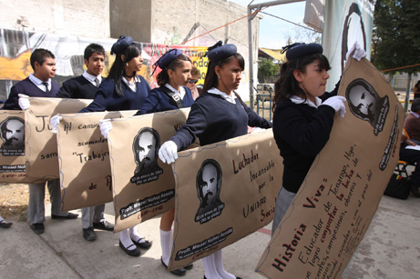 Alumnos de la telesecundaria 190 José Vasconcelos, en Nezahualcóyotl, participaron en el homenaje al profesor Misael Núñez –asesinado hace 30 años–, considerado uno de los símbolos de la lucha magisterial. En el acto, la Coordinadora Nacional de Trabajadores de la Educación, que señala a Elba Esther Gordillo entre los autores intelectuales de ese crimen, exigió que el caso no quede impune Foto María Luisa Severiano