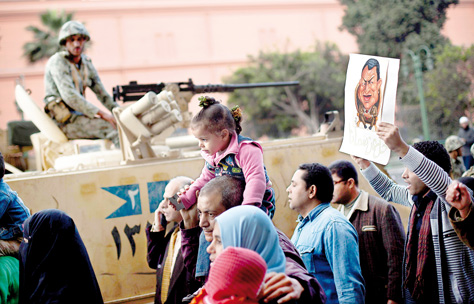 Las manifestaciones contra la permanencia de Hosni Mubarak en el gobierno egipcio continuaron en varias poblaciones. En la plaza Tahir (Libertad), en El Cairo, los inconformes pasaban junto a los vehículos blindados de las fuerzas armadas. Una anciana gritó: