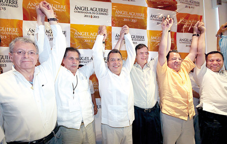 Ángel Aguirre Rivero (al centro), candidato de la coalición Guerrero nos Une –integrada por el PRD, el PT y Convergencia– celebra en Acapulco su holgada ventaja en los comicios celebrados ayer en esa entidad. Lo acompañan Manuel Camacho Solís, Jesús Ortega, Marcelo Ebrard, Luis Walton y Jesús Zambrano Foto Notimex