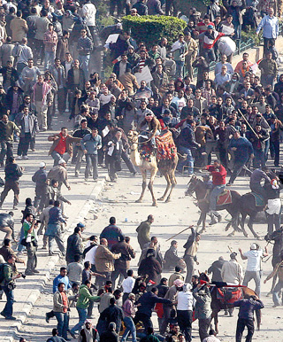 Los partidarios del presidente egipcio Hosni Mubarak metieron cuatro caballos y un camello durante la cruenta batalla campal, que duró casi todo el día, en la plaza Tahrir, en El Cairo. La cadena Al Jazeera subrayó que,
