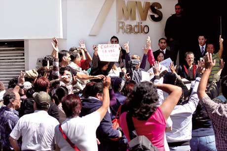 Decenas de radioescuchas de Carmen Aristegui se manifestaron durante casi tres horas frente a las oficinas de MVS Radio, en Polanco, y las clausuraron simbólicamente por el despido de la periodista. La medida de la empresa también generó un intenso debate entre los usuarios de Twitter, quienes señalaron que la rescisión de contrato es a cambio de que le renueven la concesión del espectro radioeléctrico a Multivisión. Mony de Swaan, titular de la Comisión Federal de Telecomunicaciones, escribió en su cuenta: