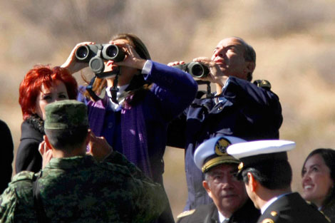 El presidente Felipe Calderón y su esposa Margarita Zavala observan las maniobras en la Base Aérea Militar 11, en la localidad de El Saucillo, Chihuahua. En el acto, el mandatario dijo que las fuerzas armadas