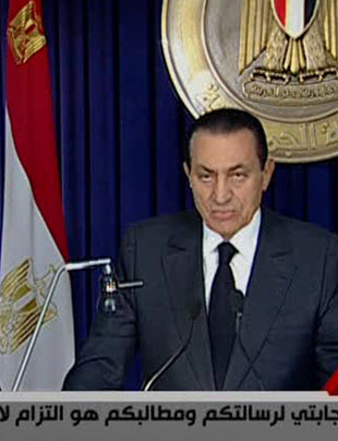 Demacrado, el presidente egipcio Hosni Mubarak se presentó ante las cámaras de la televisión estatal para descartar su pronta salida. Prometió que investigaría los asesinatos de opositores perpetrados durante los que llamó