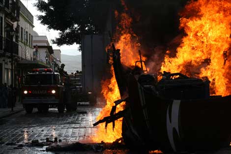 En 15 cuadras del centro de la capital oaxaqueña ocurrieron los enfrentamientos entre integrantes de la sección 22 del SNTE y de la Asamblea Popular de los Pueblos de Oaxaca con agentes de las policías federal y estatal, quienes les impidieron el paso. Según los reportes, hubo varios autos dañados, un tráiler incendiado y ventanas y puertas de negocios destruidos Foto Jorge Pérez Alfonso