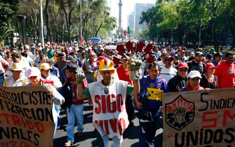Integrantes de los gremios minero, electricista, de tranviarios y de telefonistas, así como trabajadores de la UNAM, realizaron una marcha del Ángel de la Independencia a la sede de Grupo México, en Polanco, para exigir justicia para los deudos de 65 obreros fallecidos en la explosión en Pasta de Conchos, Coa-huila, en febrero de 2006. Organismos de defensa de los derechos humanos señalan que el gobierno mantiene la protección y encubrimiento para el consorcio, al tiempo que solapa la inseguridad y corrupción en yacimientos de carbón Foto Marco Peláez