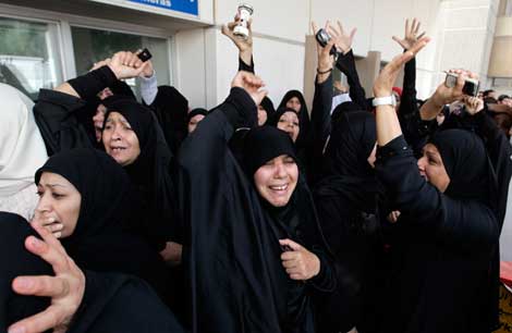 Decenas de mujeres lanzan consignas antigubernamentales luego de que las fuerzas policiales arrojaron gases lacrimógenos y dispararon perdigones contra un campamento en Manama, capital de Bahrein. El opositor partido chiíta Wefaq se retiró de la cámara baja y exigió la renuncia del gobierno Foto Ap
