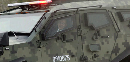 En el Día del Ejército, celebrado ayer en las instalaciones del décimo regimiento motorizado con sede en Reynosa, Tamaulipas, el presidente Felipe Calderón anunció un paquete de ayudas económicas para las fuerzas armadas y el envío de cuatro batallones más a la región noreste. En el acto, el Ejecutivo dijo que a su gobierno le ha tocado enfrentar el desafío de la mayor amenaza a los mexicanos: el crimen organizado. En la imagen, el mandatario prueba personalmente uno de los vehículos tácticos suncat, diseñados por militares para combatir con más eficacia a las bandas criminales. También le fueron mostrados transportes decomisados a delincuentes y adaptados con armas de alto poder Foto José Antonio López