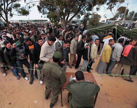 Miles de personas que abandonan Libia por la frontera con Túnez son revisadas por soldados de ese último país, antes de instalarse en el campamento de refugiados de Ras Ajdir. Los migrantes llegan con pocas pertenencias y dan cuenta de que la represión es atroz Foto Ap