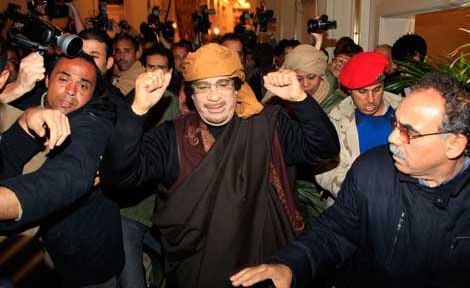 El gobernante libio llega a un hotel de Trípoli para una entrevista de televisión. Tanto el régimen como la oposición desmintieron ayer que el coronel haya hecho una oferta de negociación para dejar el cargo, en la que pedía garantías para no ser enjuiciado junto con su familia. Las tropas afines al dictador intensificaron ayer sus ataques, con tanques y aviones, contra la ciudad de Zawiya, a 50 kilómetros de la capital. Según testigos, el centro de la urbe