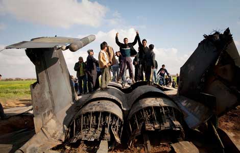 Varios ciudadanos libios se arremolinaron en torno al avión de combate estadunidense que se precipitó cerca de la ciudad de Bengasi, controlada por rebeldes. Sus dos pilotos lograron abandonar la nave y fueron rescatados. La acción de salvamento se vio empañada por acusaciones de que algunos pobladores fueron heridos por la metralla de naves occidentales que protegían la operación Foto Ap