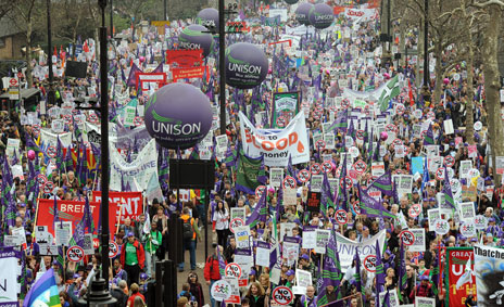 Más de 400 mil personas asistieron a la movilización convocada en Londres (en la imagen) contra el duro proyecto presupuestario presentado por el gobierno, el cual contempla elevar a 20 por ciento el impuesto al valor agregado, así como la congelación y disminución de salarios. En Alemania se manifestaron unos 300 mil para exigir el cierre de reactores atómicos en el país. Marchas con la misma demanda se realizaron en Suiza e Italia. En Washington, estadunidenses y libios residentes se concentraron frente a la Casa Blanca en rechazo a Muammar Kadafi y en apoyo a los rebeldes en Libia; sin embargo, exigieron