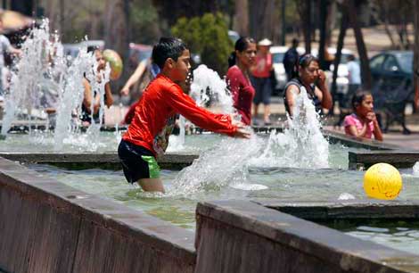 Las altas temperaturas continuaron en la capital del país. El Sistema de Monitoreo Atmosférico de la Ciudad de México reportó también niveles de ozono de 130 unidades Imeca en dos zonas del valle de México. El organismo reiteró su llamado a no realizar actividades prolongadas al aire libre, beber agua con regularidad y utilizar bloqueador solar. En las fuentes del bosque de Chapultepec los niños no desaprovecharon la oportunidad de refrescarse Foto Cristina Rodríguez