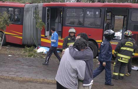 El percance ocurrió en el cruce de avenida Jalisco y la calle Iturbide, cuando la unidad 380 del Metrobús, conducida por Juan Francisco Olguín Escobedo, perdió el control y arrolló a varias personas en un camellón, para después estrellarse contra un autobús que cubre la ruta de Tacubaya a Valle Dorado. Además de las dos personas fallecidas, 12 resultaron lesionadas, dos de hospitalización. El director de ese sistema de transporte, Guillermo Calderón Aguilera, dijo que víctimas y familiares tendrán el apoyo del gobierno capitalino para recibir indemnizaciones Foto La Jornada