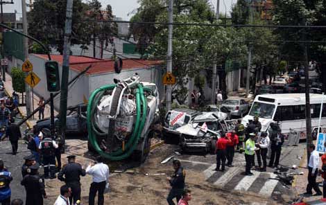 Un camión de desazolve proveniente del estado de México, aparentemente sin frenos, arrolló a seis vehículos en avenida Constituyentes, esquina Melchor Múzquiz, colonia San Miguel Chapultepec, para luego chocar con un microbús; varios lesionados fueron hospitalizados. El accidente, ocurrido alrededor de las 13 horas, generó caos vial en la zona, pues los vehículos siniestrados quedaron prácticamente deshechos y se dificultó su remoción. El chofer del transporte, marca Vactor, fue trasladado a un nosocomio en calidad de detenido Foto Alfredo Domínguez