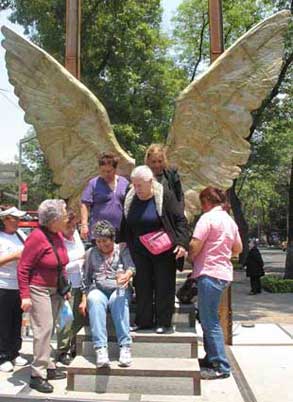 Un grupo de mujeres posa junto a una de las 13 esculturas monumentales en bronce del mexicano Jorge Marín, que se exhiben desde septiembre en el camellón de Paseo de la Reforma –frente al Museo Nacional de Antropología–, como parte de la exposición Las Alas de la Ciudad. Los transeúntes pueden interactuar con las obras, seres fantásticos de metal que pesan entre 200 y 500 kilogramos cada uno Foto Carlos R. Mamahua