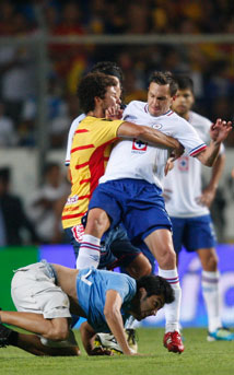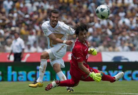 Aunque el equipo Guadalajara nunca se dio por vencido, la escuadra auriazul impuso sus condiciones en el estadio México 68. En la imagen, el portero rojiblanco Luis Ernesto Michel sale a bloquear al paraguayo Dante López Foto Víctor Camacho