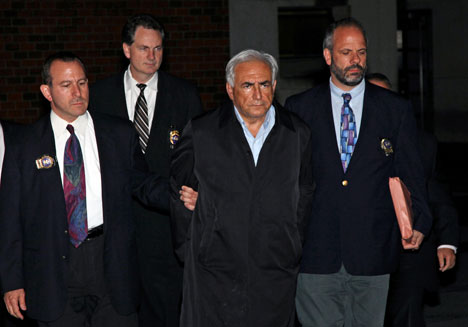 Dominique Strauss-Kahn, director general del Fondo Monetario Internacional, es conducido a una unidad especial de la policía de Nueva York, luego de ser detenido. El funcionario fue acusado ayer formalmente de
