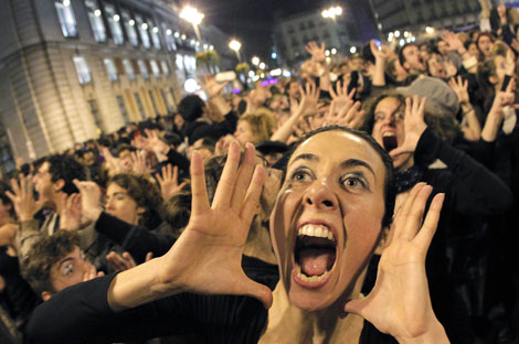 Mientras la Junta Electoral Central de España prohibió ayer toda manifestación en vísperas de las elecciones municipales del próximo domingo, decenas de miles de personas volvieron a romper el cerco policial para protestar por quinto día consecutivo en las principales ciudades del país ibérico, en rechazo al modelo político y económico vigente. El movimiento, que se coordina por Internet a través de las redes sociales, decidió mantener el repudio y campamentos en las calles. Los gritos se multiplicaban: