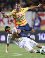El equipo auriazul abrió el marcador con un golazo de Francisco Palencia, y cuatro minutos después Joao Rojas anotó el empate en el partido de ida de la final del torneo Clausura 2011. En la imagen, el michoacano Aldo Ramírez y el universitario David Cabrera Foto Reuters