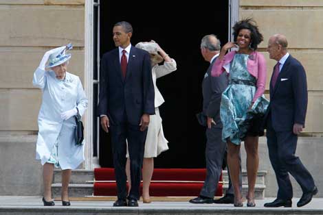 La reina Isabel II, el presidente estadunidense y su esposa Michelle, así como el príncipe Felipe, momentos antes de ingresar al Palacio de Buckingham, donde se ofreció una cena de gala para los visitantes. Barack Obama, quien inició una visita oficial de tres días, elogió el respaldo de Gran Bretaña después de los ataques del 11 de septiembre de 2001 y el apoyo para combatir el terrorismo global Foto Ap